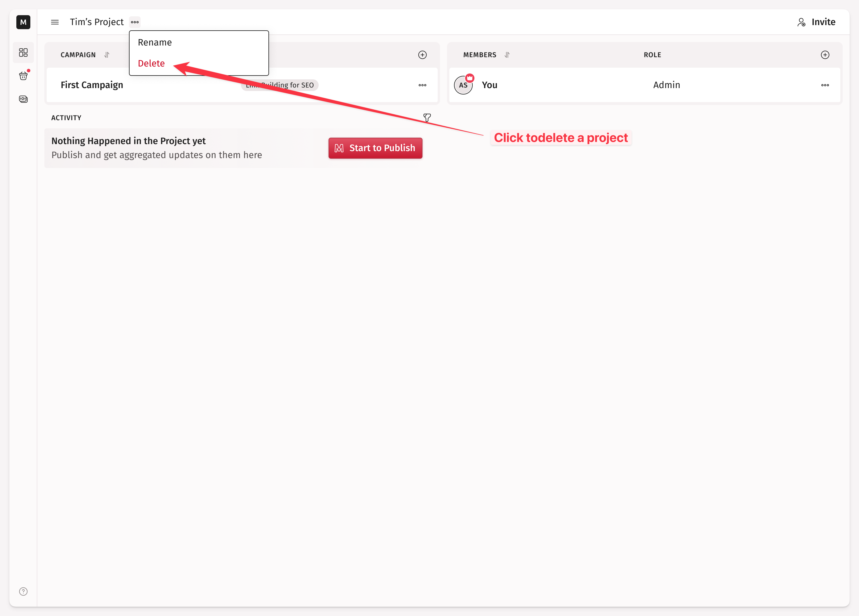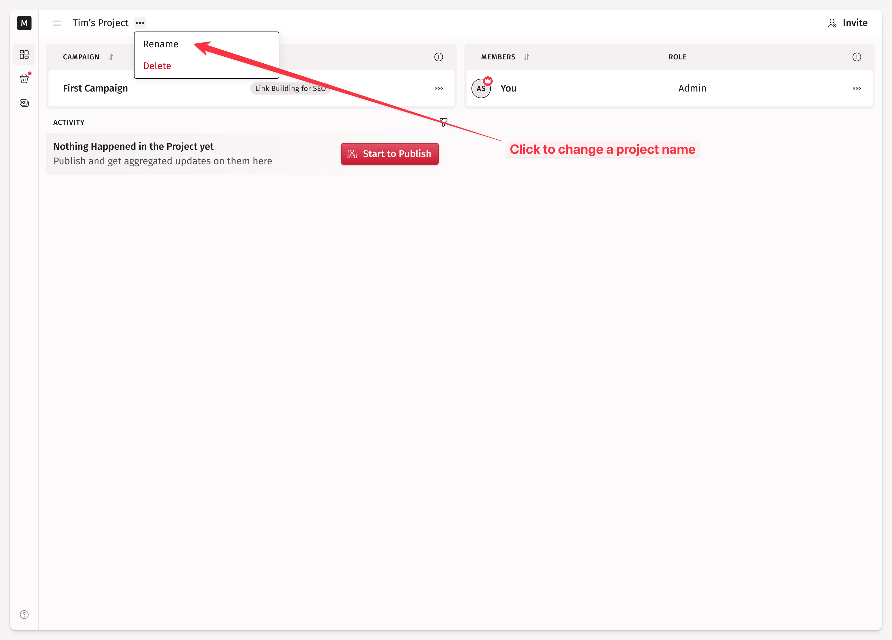 Go to the client dashboard and click the three-line button near the open project name. Click +, name your new project, and save it. You have created a new project. Now, you can add campaigns and invite members to it.