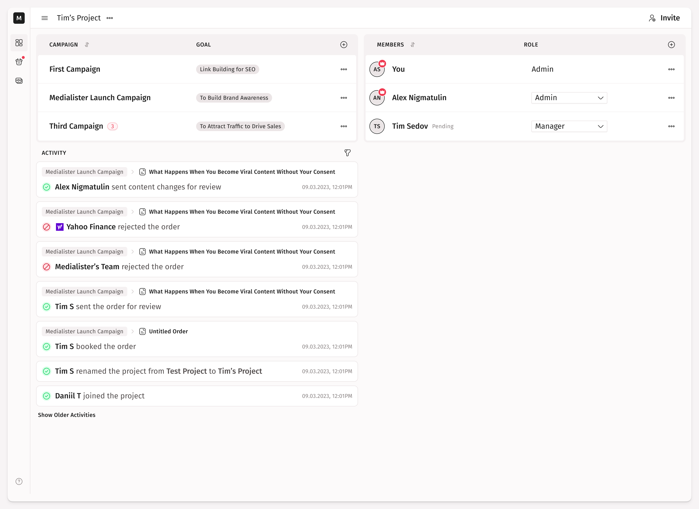 In every project, you can see aggregate activities from all the campaigns within this project, and the project changes over time. It can help to have a bird-view of what’s going on with the project without going inside every campaign and placement one by one.