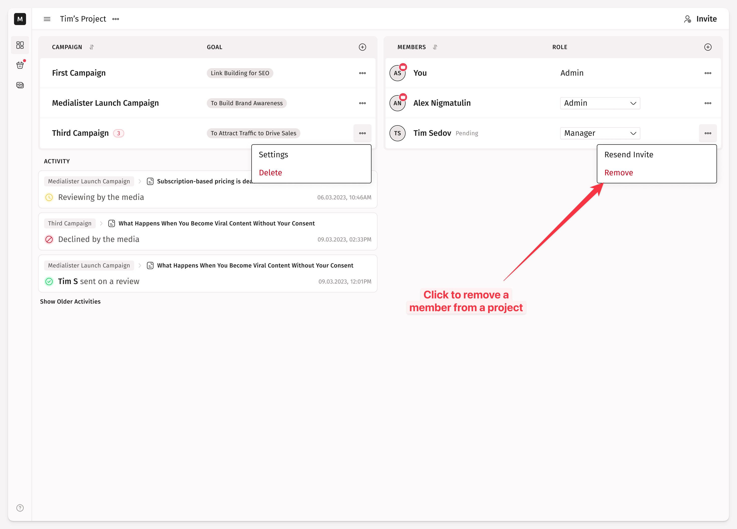 Go to a project, find the table with members and click the three-dot button for a member you want to remove from the project. Click Remove and confirm the action.