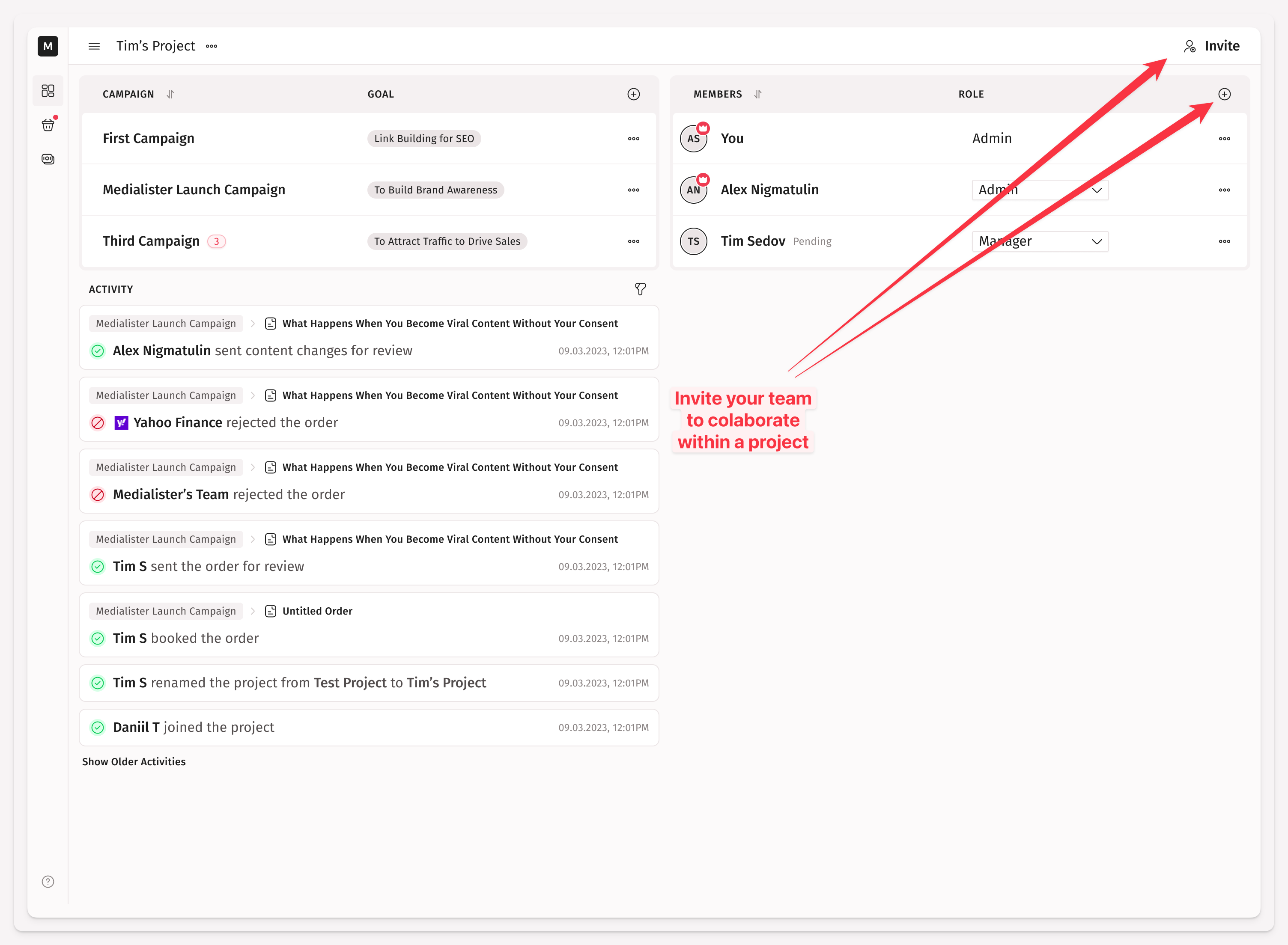 Projects are collections of campaigns. It makes managing multiple campaigns and members’ accesses and rights easier.