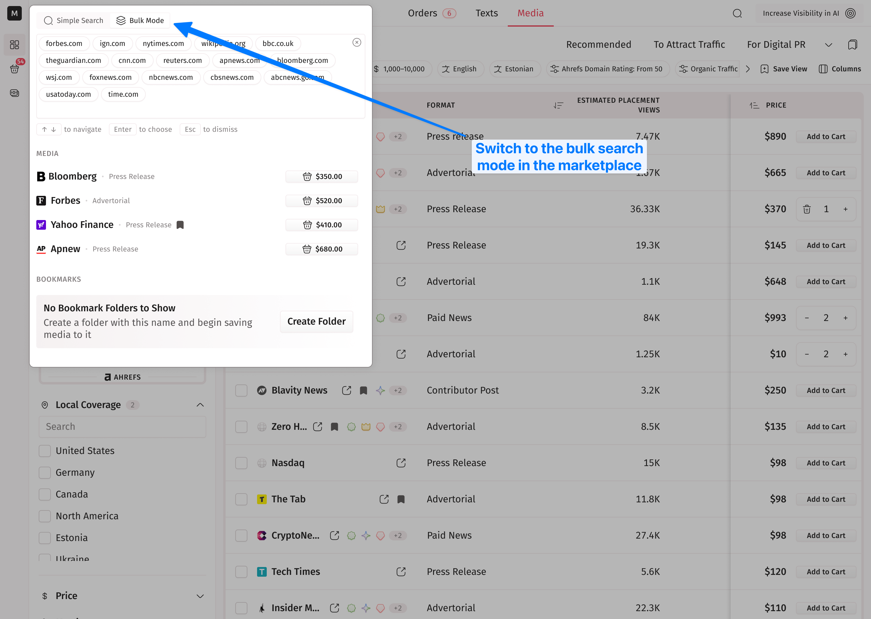 Find media outlets fast using the search bar at the top of the marketplace.