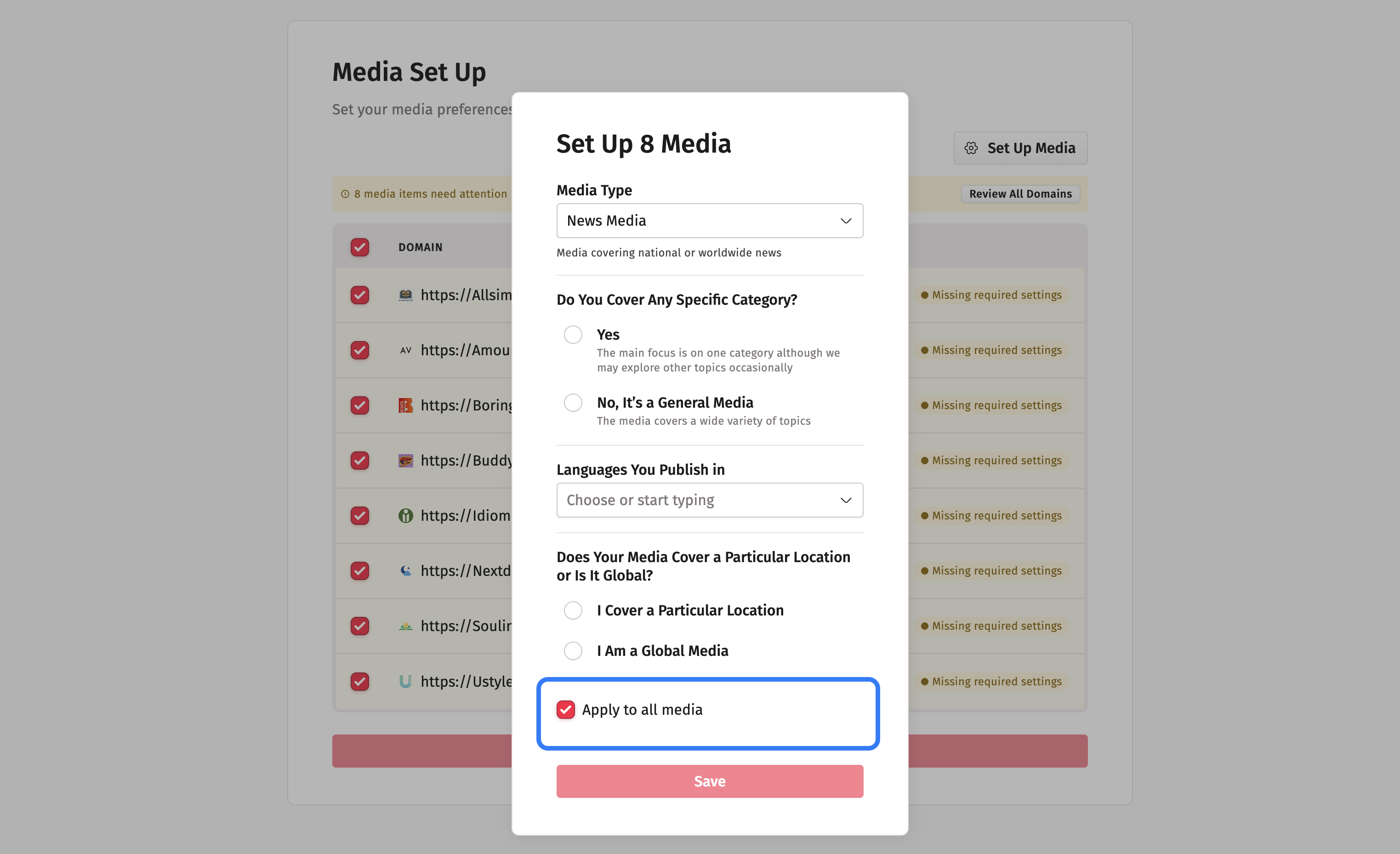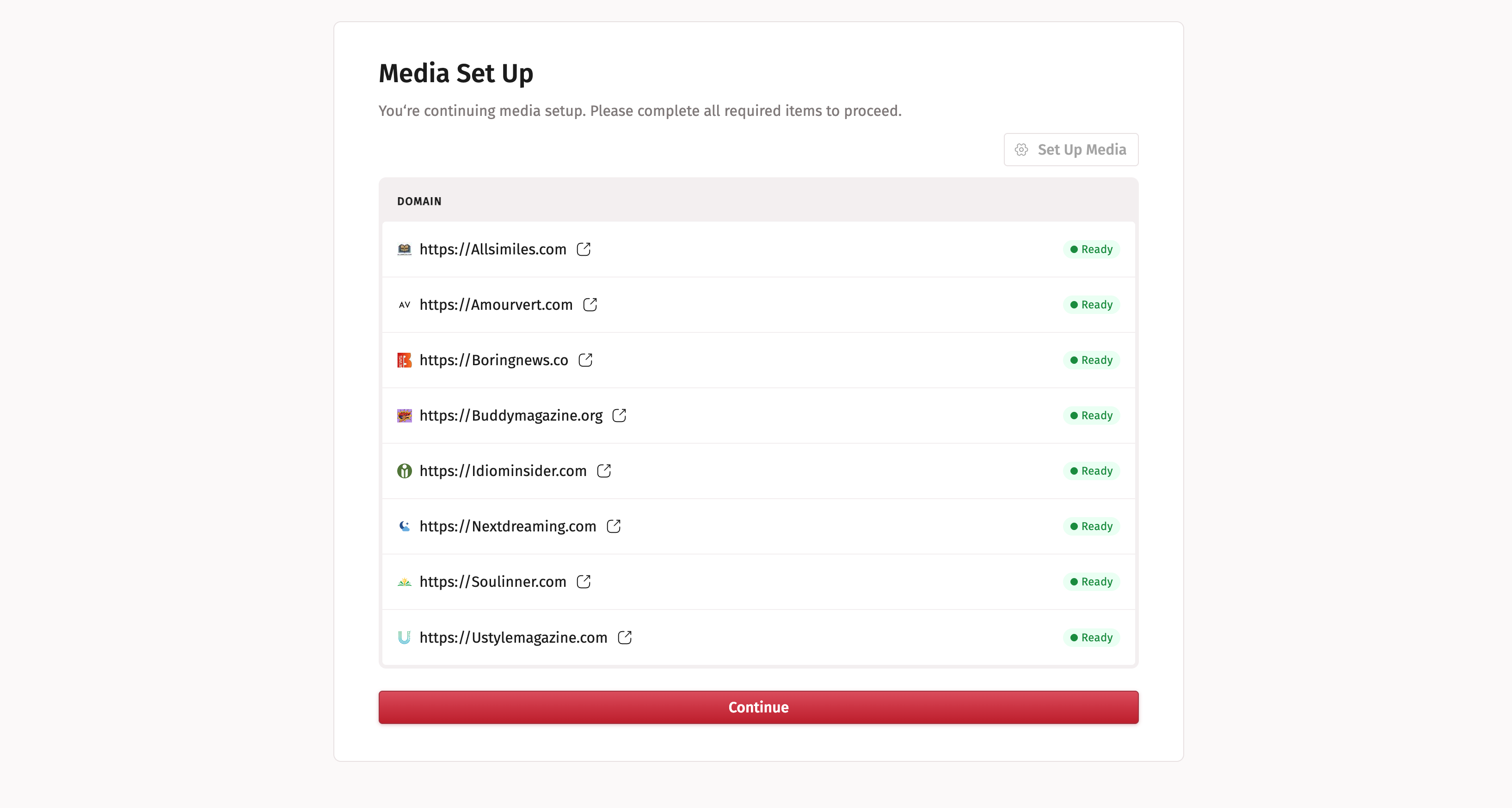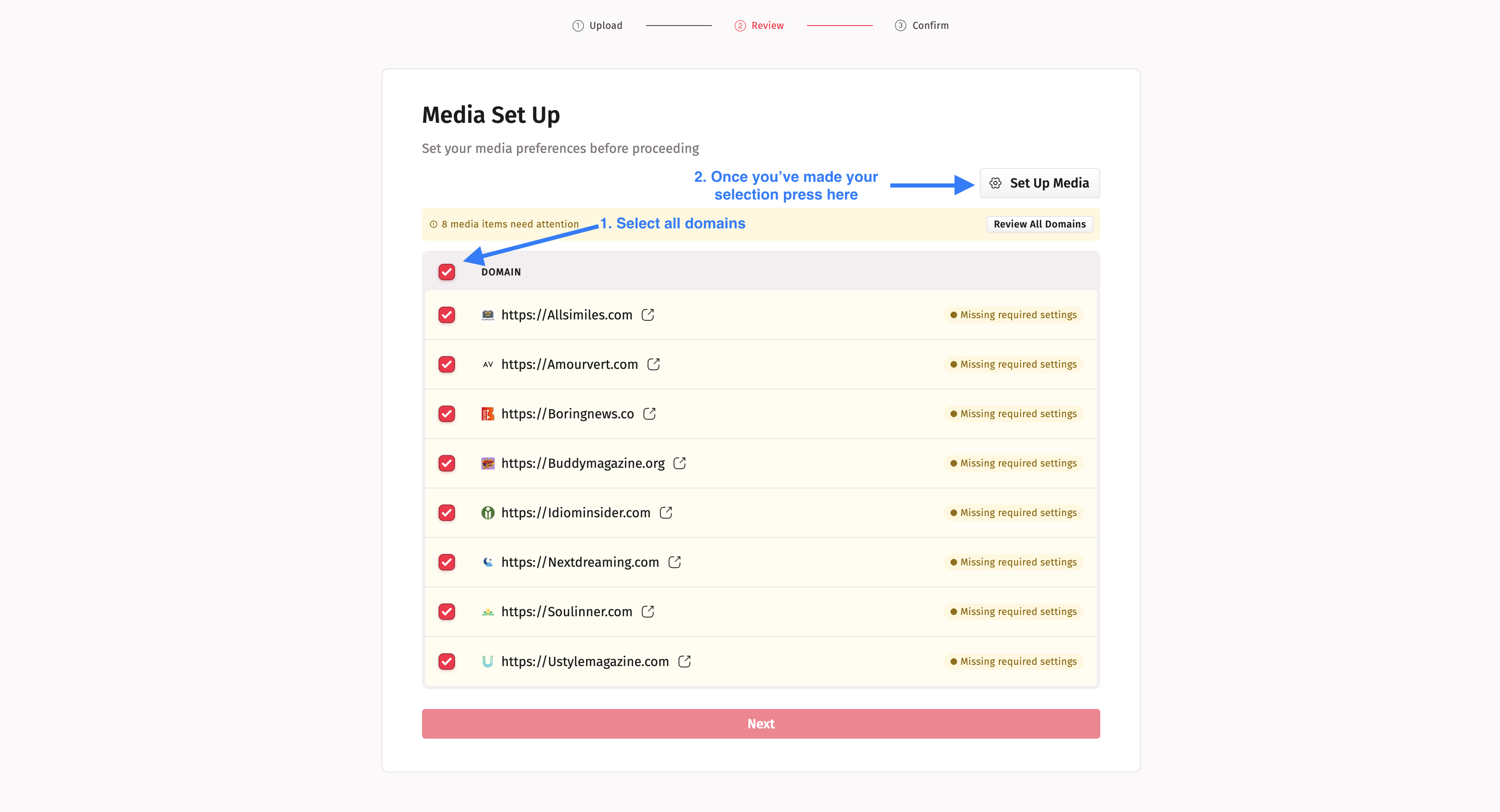 You’ll now see the list of media you just added. To continue, select all domains—or choose specific ones if needed—and click Set Up Media.