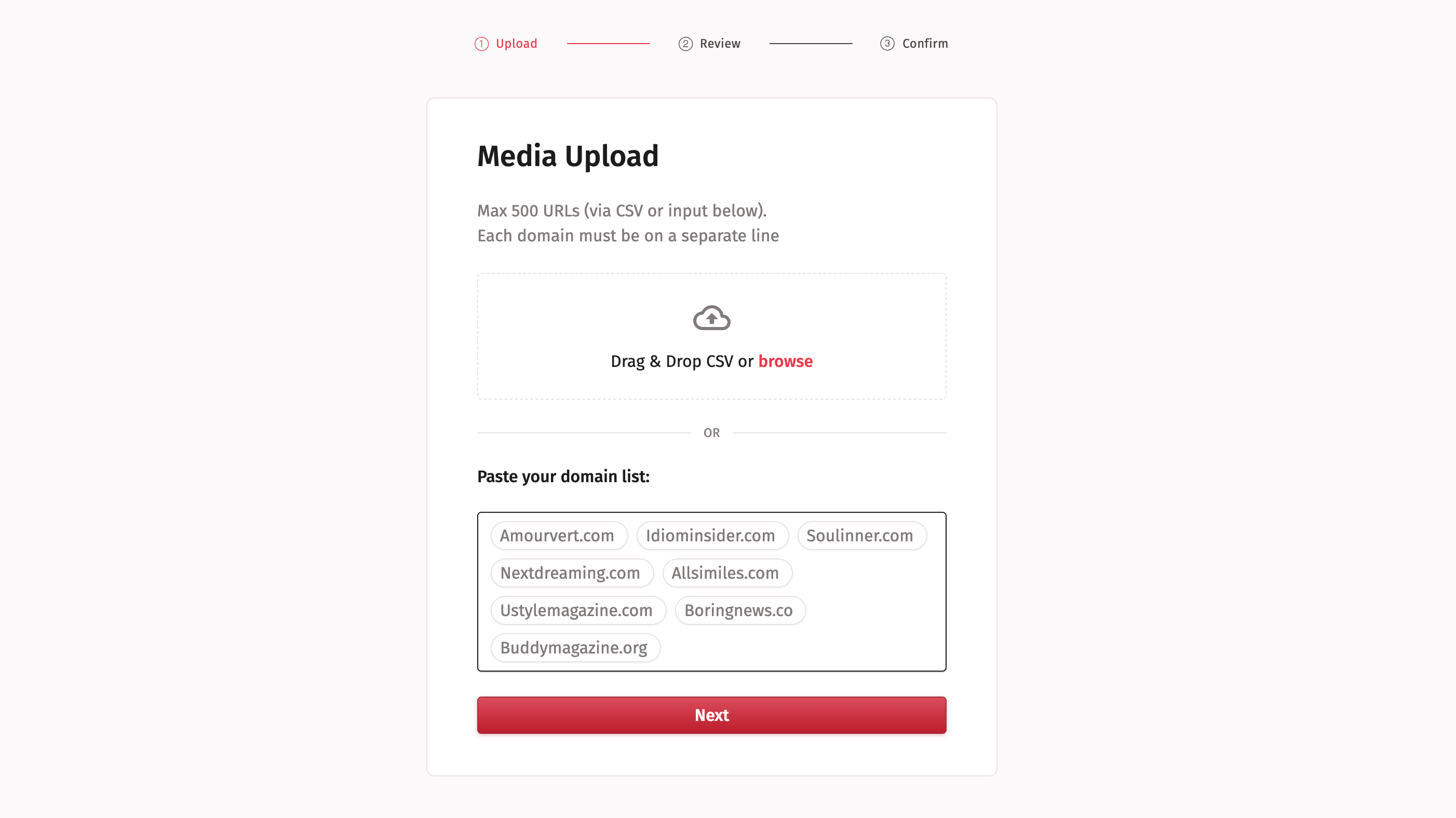 You can either paste the list of media you'd like to upload or attach a CSV file. To continue, press Next.