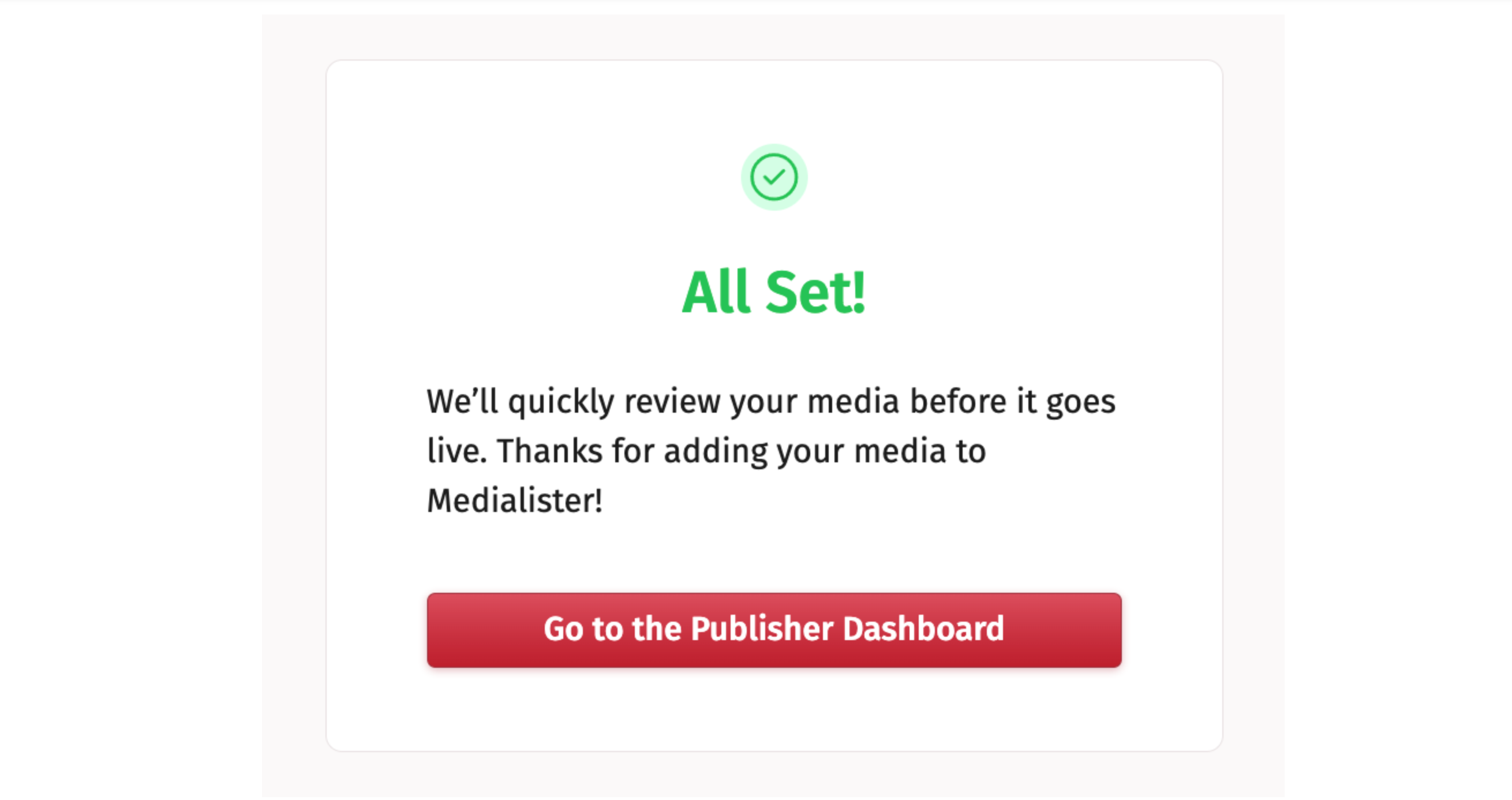 Next, a pop-up will appear letting you know that the Medialister team will review your media. Once approved, you’ll be able to proceed with adding your offers.