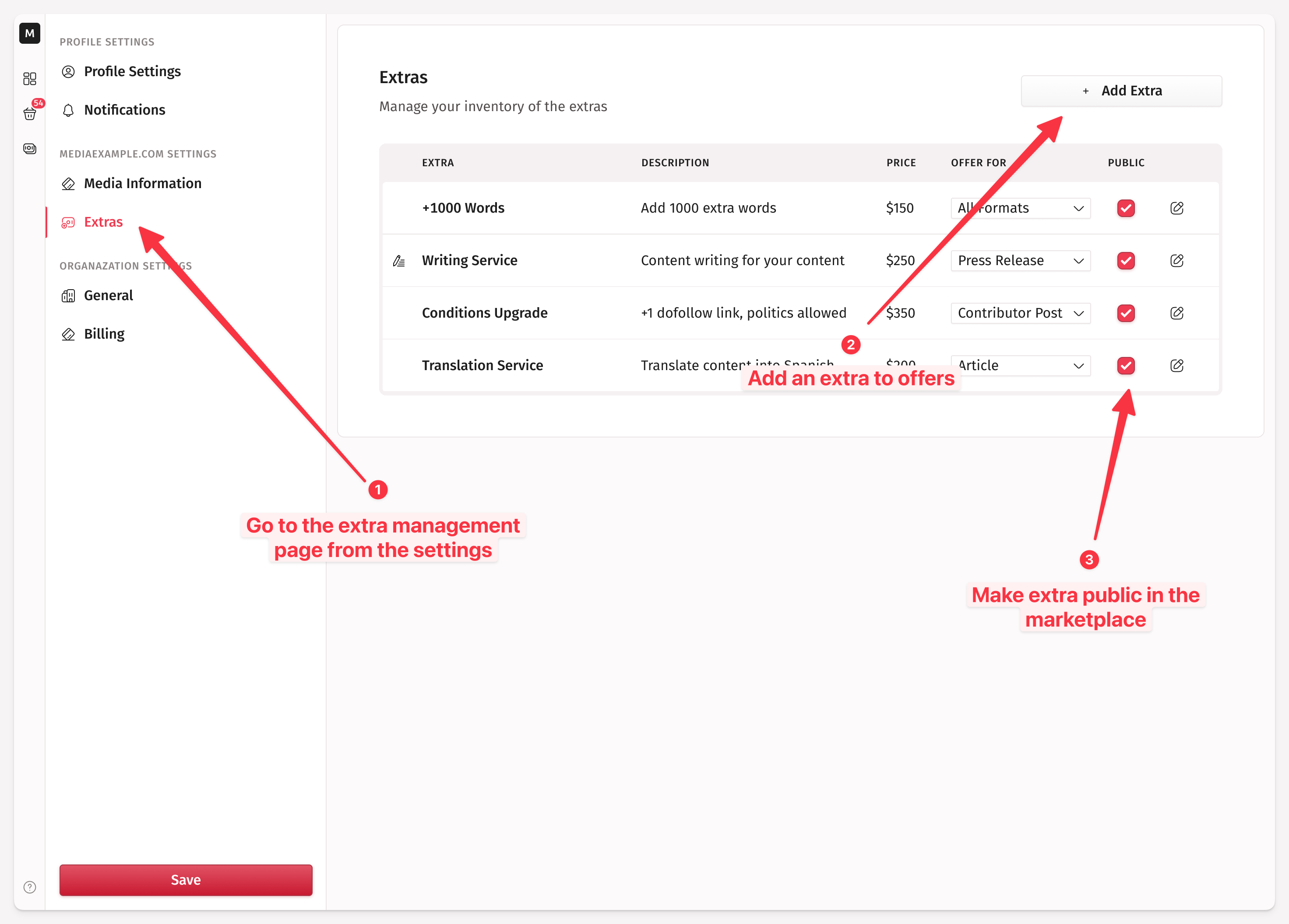 Create a new extra. Specify the name of the additional service (for example, non-thematic content, a publisher-written article, or a custom topic), the service description, and the extra fee you charge for this service.