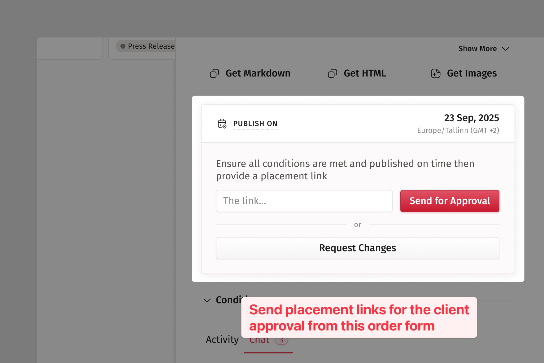 After you publish the article on your website, insert the live URL of the article in the provided field and click Send for Approval.