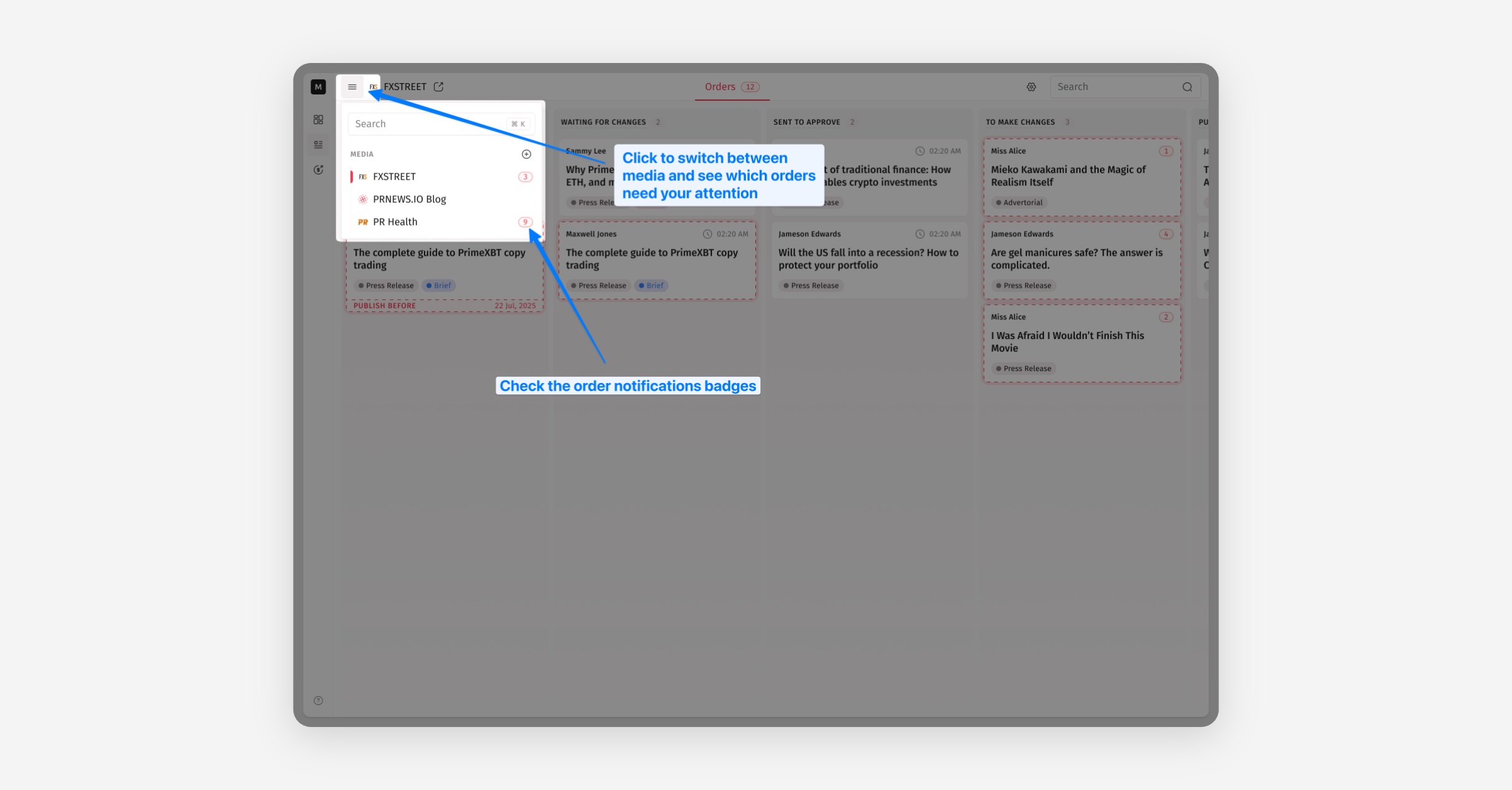 If you manage more than one website, switch between media to see which one has an order waiting for your action.