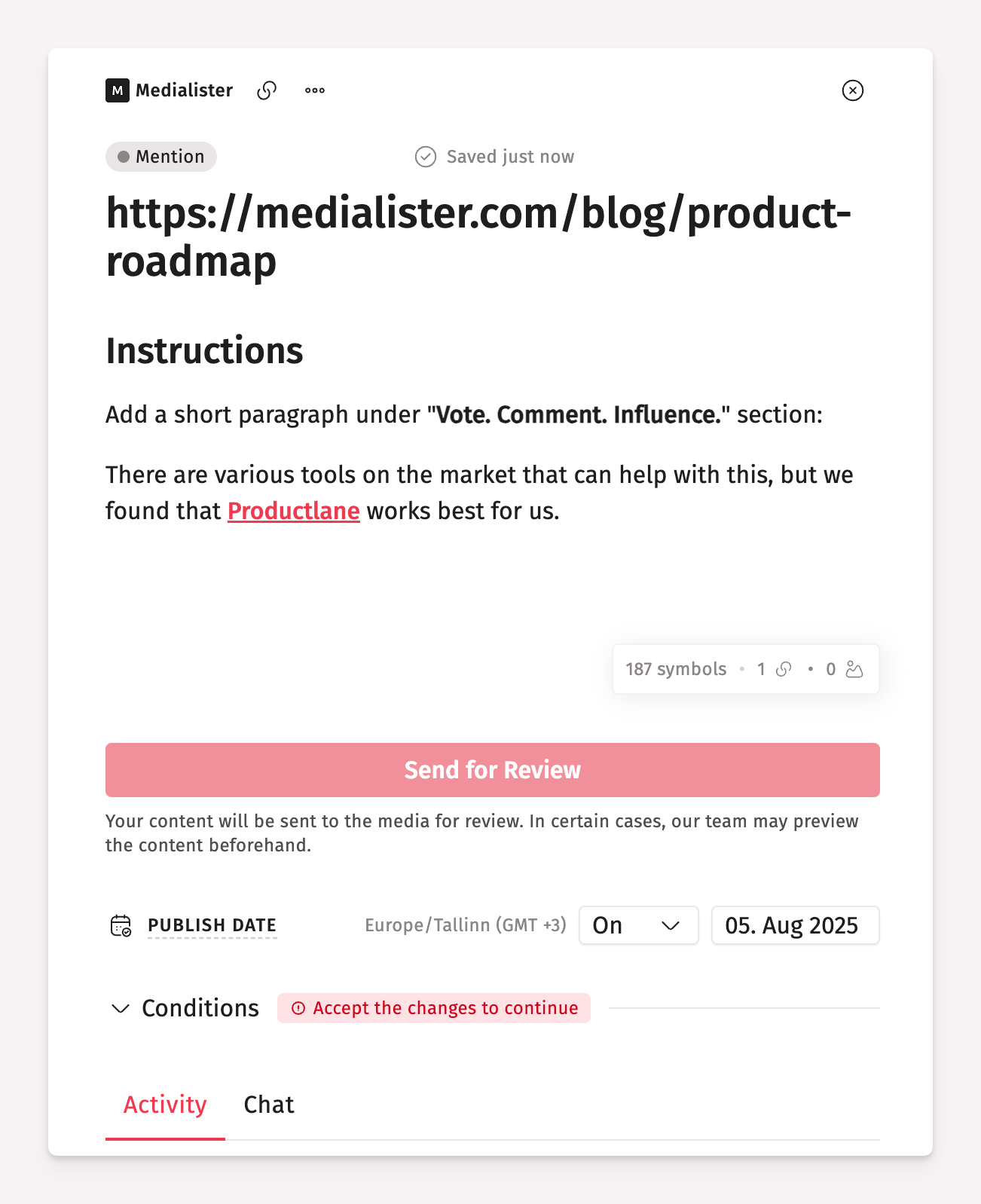 After the booking, provide a link, anchor text, and a short sentence, if necessary, in the content area and send it on review after. You can either recommend a URL to embed a mention or let the editor find it for you.